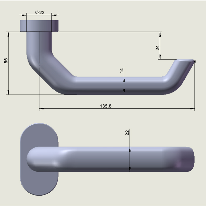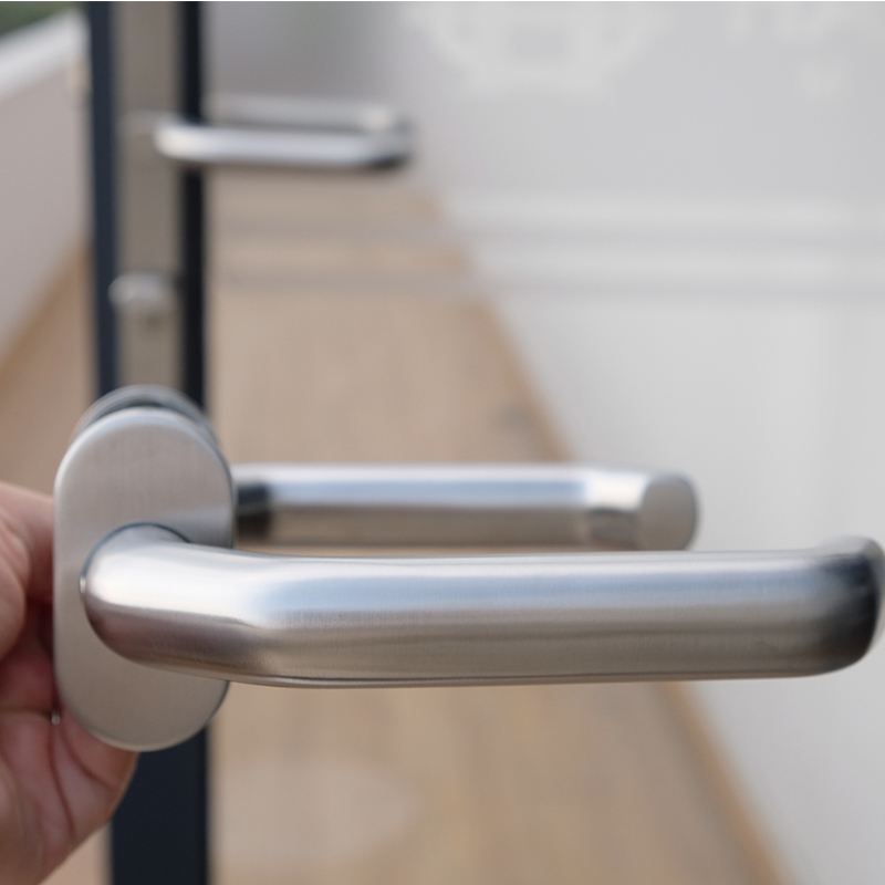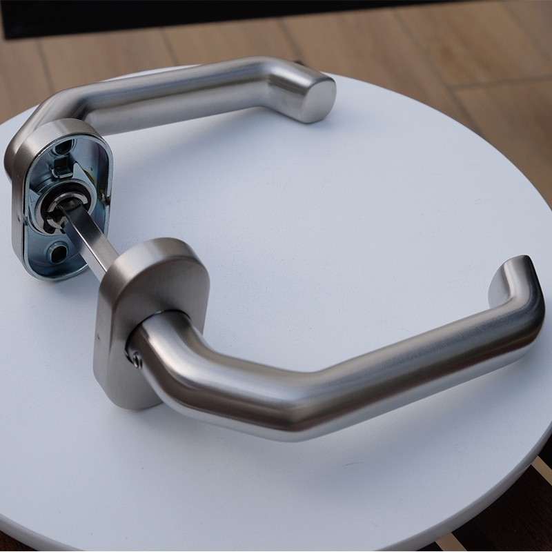 This LHH19 stainless steel door handle assembly features a solid oval backplate and a one-piece spindle structure. The brushed metal finish boasts a clear and smooth texture, and the square handle outline seamlessly integrates with the rounded grip end. The handle is approximately 135.8 mm long, 22 mm in diameter, and 55 mm in height from the mounting base. From a user experience perspective, the handle offers a stable grip, comfortable hand position, and even weight distribution. The 22 mm cylindrical grip diameter provides a comfortable hold while maintaining structural rigidity. The brushed surface reduces fingerprints and provides a consistent tactile feel. The geometric contour design ensures controllable downward rotation resistance, guaranteeing smooth bolt retraction during operation.